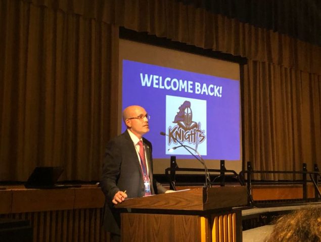 Elwood’s Superintendent of Schools Dr. Kenneth Bossert welcomes staff members to the start of the 2019-20 school year.