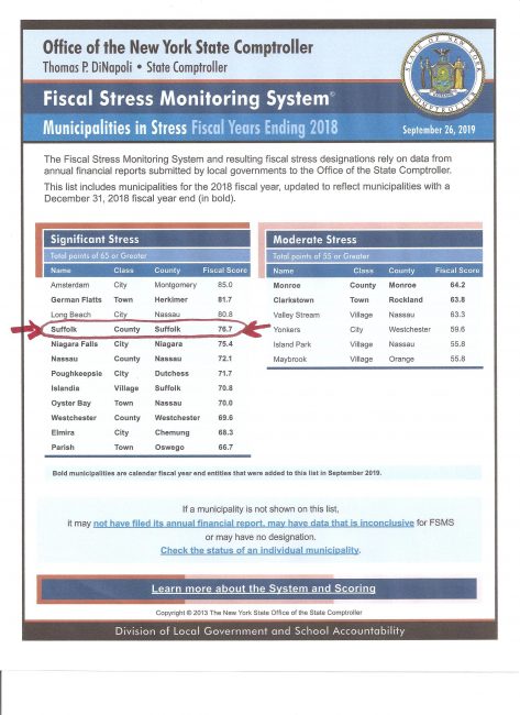 A recent report from New York State Comptroller Thomas DiNapoli’s office revealed that, for the second year in a row, Suffolk County has been declared the most fiscally stressed county in the state, ahead of Nassau and Westchester Counties. John Kennedy, Candidate, Suffolk County Executive, said these findings reveal what was known all along: that Suffolk County is in a fiscal crisis.