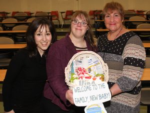 Brittany hand-delivers or mails baskets filled with baby blankets knitted with love, “Down Right Perfect” onesies, and information relating to raising a baby with Down syndrome, including textbooks, pamphlets and educational resources for parents.