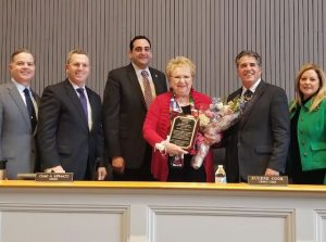 In the photo (l-r): Councilman Edmund J.M. Smyth; Councilman Mark Cuthbertson; Supervisor Chad A. Lupinacci; Town Clerk Jo-Ann Raia, holding plaque and flowers; Councilman Eugene Cook; Councilwoman Joan Cergol.