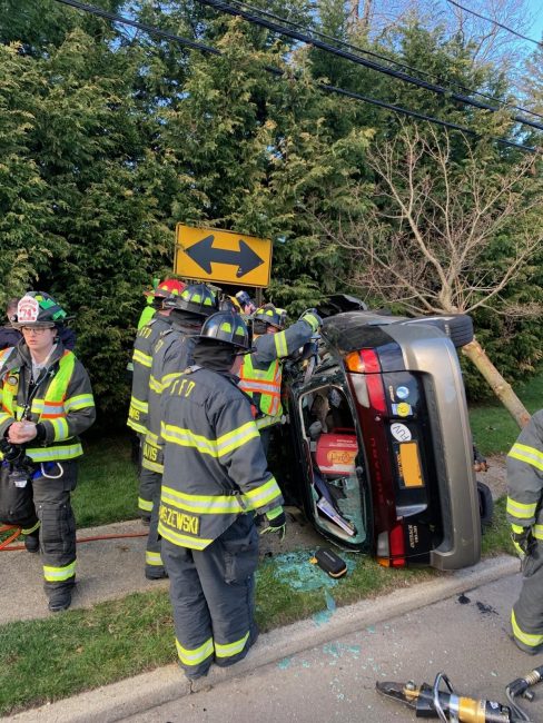 On April 4th, 2020, at 5:10 p.m., the Greenlawn Fire Department was activated for a Motor Vehicle Accident at Clay Pitts Road and Manor Road North.  Responding units were advised by Suffolk Police enroute of one vehicle that was overturned with one person trapped. Response consisted of all four chiefs, paramedic, heavy rescue quint 2-7-2 and heavy rescue engine 2-7-6, ambulances 2-7-45, 2-7-25, and 2-7-5 to the scene.  Engine 2-7-8 responded to the landing zone for a possible Medivac.  Upon completion of the extrication process to gain access to the patient, it was determined that the driver had succumbed to his injures.