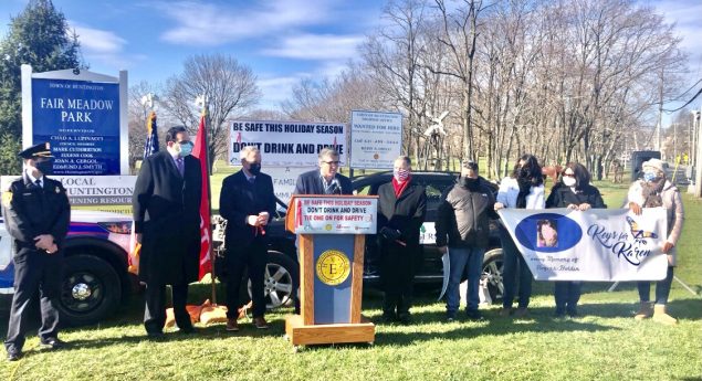 Kevin Gershowitz (standing behind podium), President, Gershow Recycling, speaks during a press conference announcing the Town of Huntington’s anti-drunk and distracted driving campaign on December 7. Also pictured (left to right): William Scrima, Officer, Suffolk County Police Department; Chad Lupinacci, Supervisor, Town of Huntington; Mark Cuthbertson and Edmund J.M. Smyth, Council Members, Town of Huntington; William Holden, husband of Karen Holden, who was killed by a drunk driver; Joanne Sperando, Ms. Holden’s friend; Lynne Rogers Pallmeyer, Ms. Holden’s sister; and Liisa Anderson, Ms. Holden’s cousin.